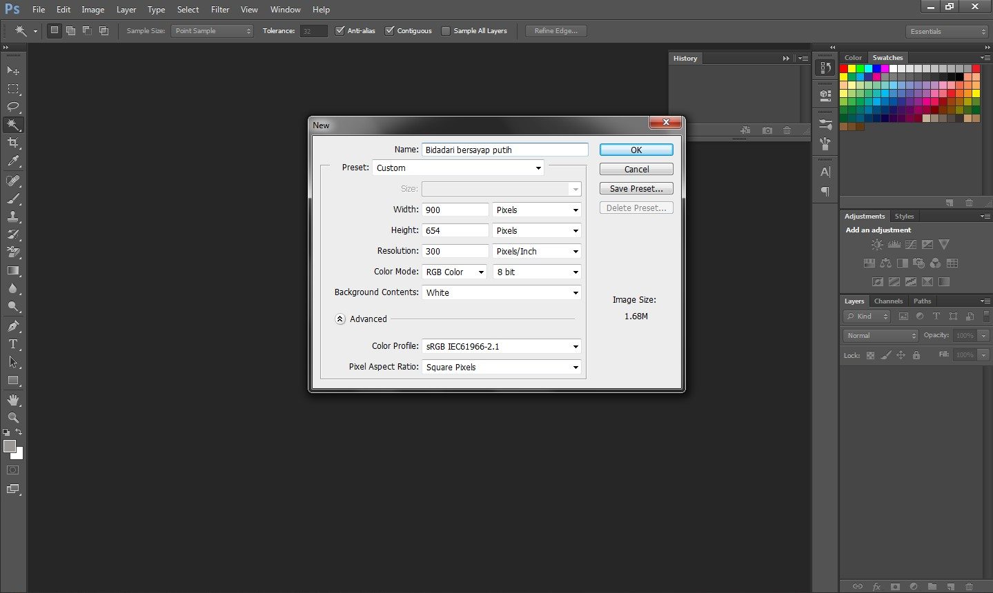 Cara yang pertama, buka lembar kerja baru dengan ukuran Width 900 pixel, Height 654 pixel dan Resolution 300.