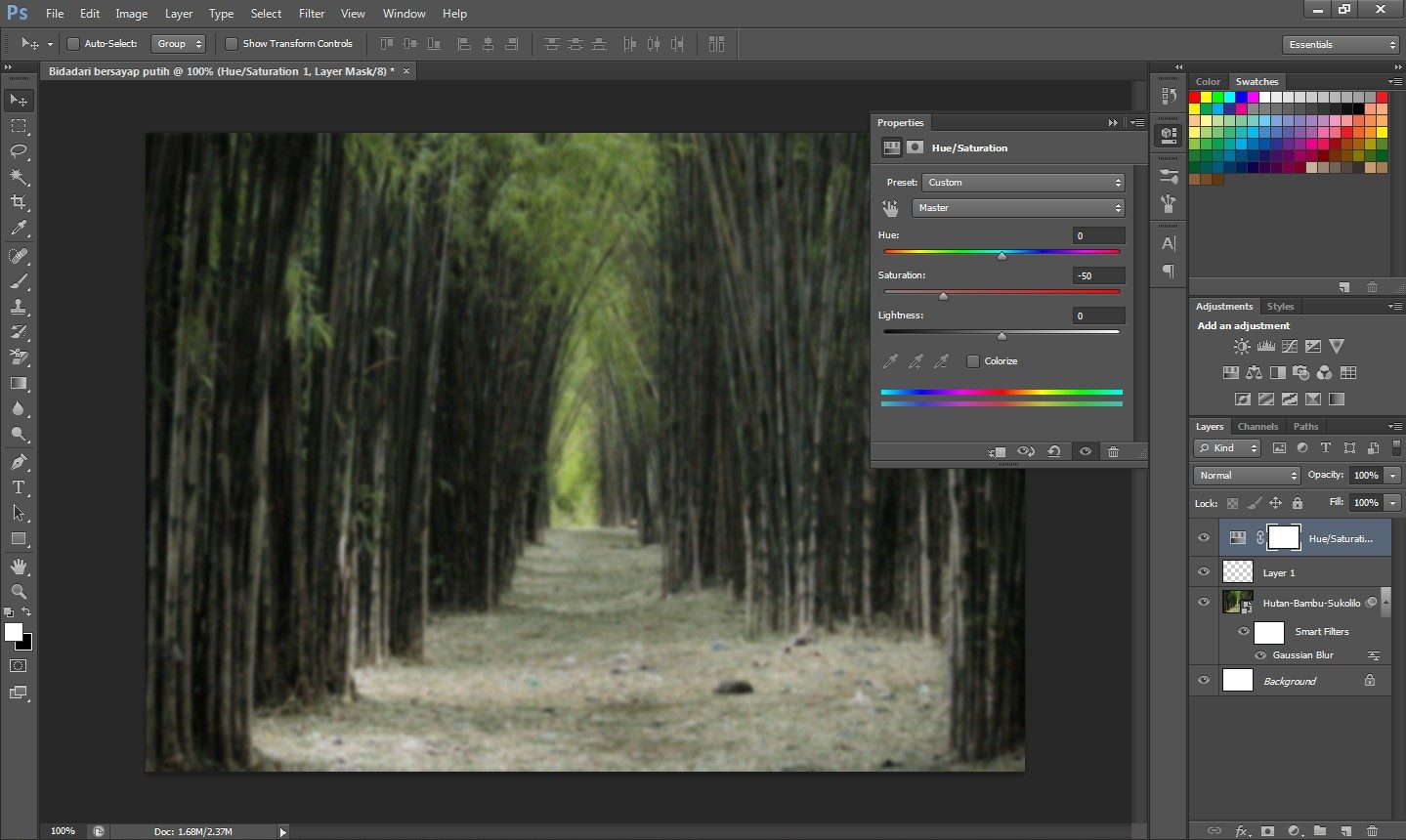 Layer-New Adjusment Layer-Hue/Saturation, atur parameternya, Hue: 0, Saturation: -50, Lightness: 0